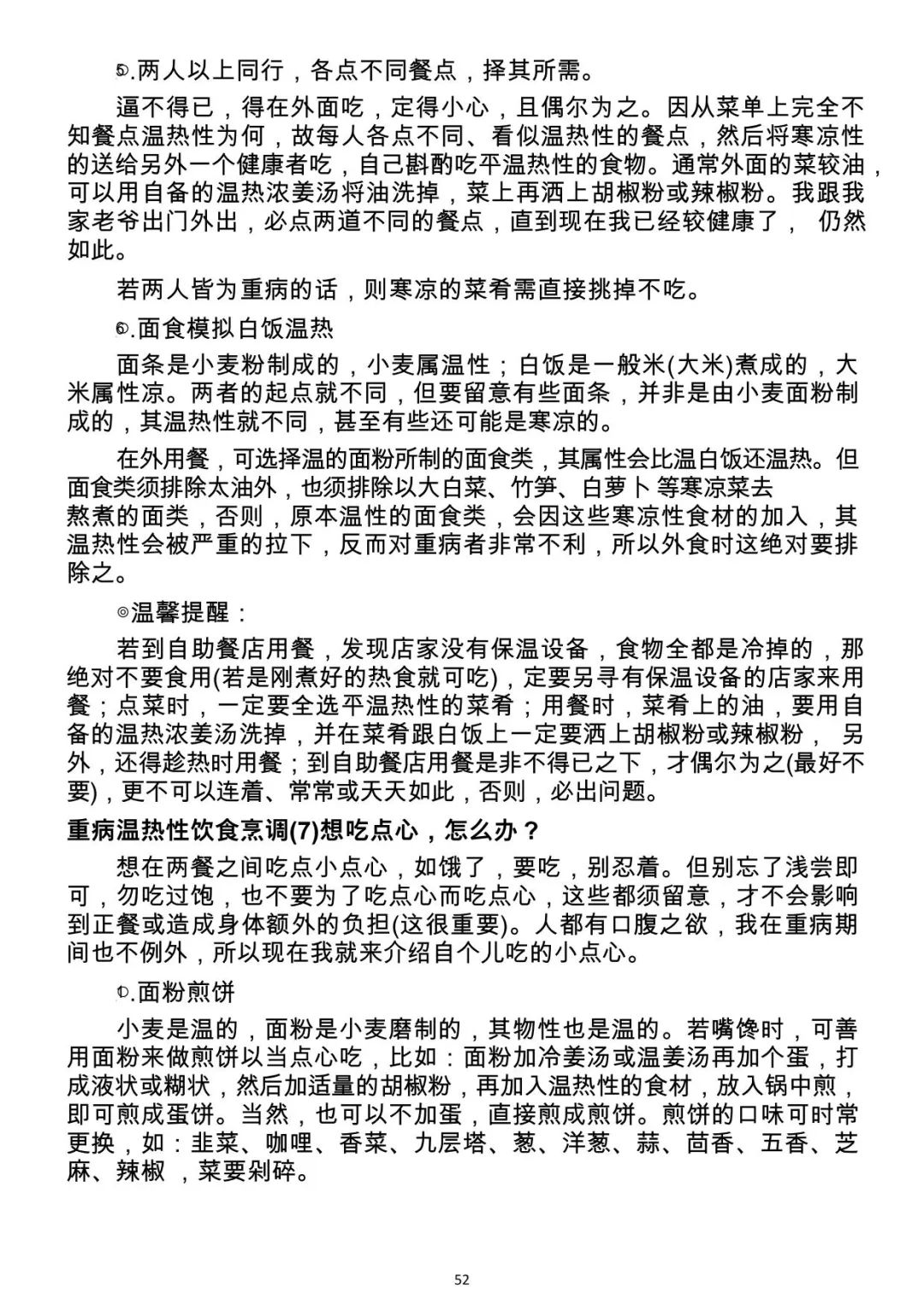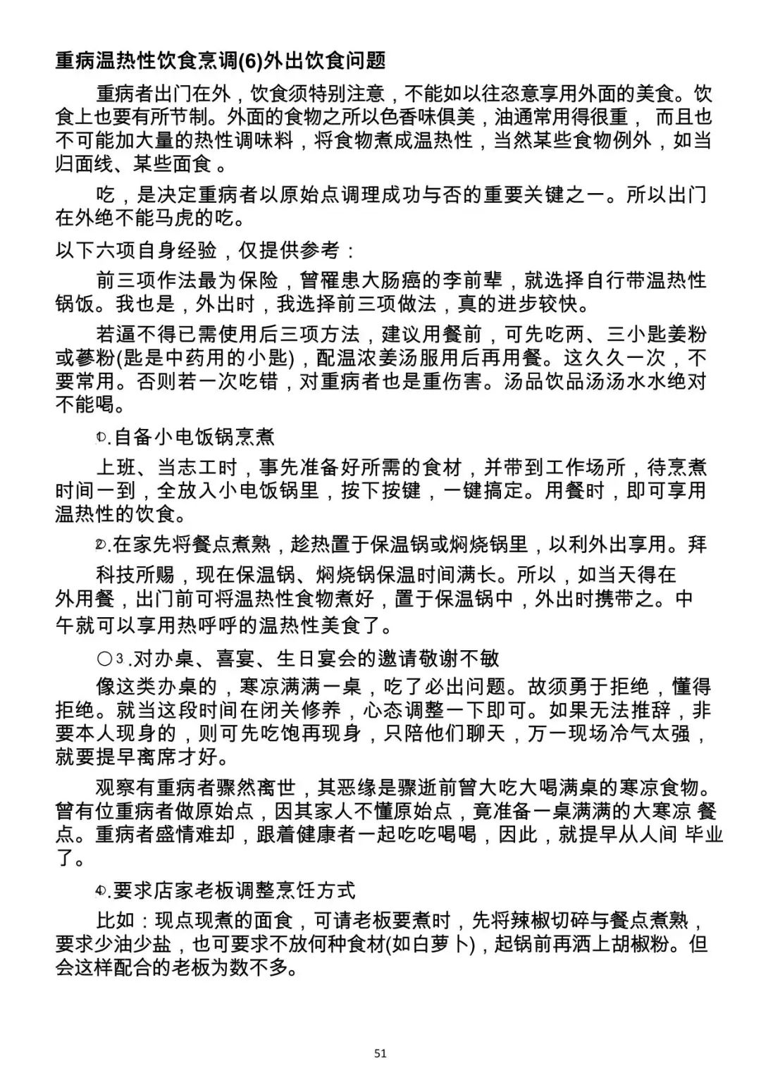 逼不得已,得在外面吃,定得小心,且偶尔为之。因从菜单上完全不知餐点温热性为何,故每人各点不同、看似温热性的餐点,然后将寒凉性的送给另外一个健康者吃,自己斟酌吃平温热性的食物。通常外面的菜较油,可以用自备的温热浓姜汤将油洗掉,菜上再洒上胡椒粉或辣椒粉。我跟我家老爷出门外出,必点两道不同的餐点,直到现在我已经较健康了, 仍然如此。 若两人皆为重病的话,则寒凉的菜肴需直接挑掉不吃。