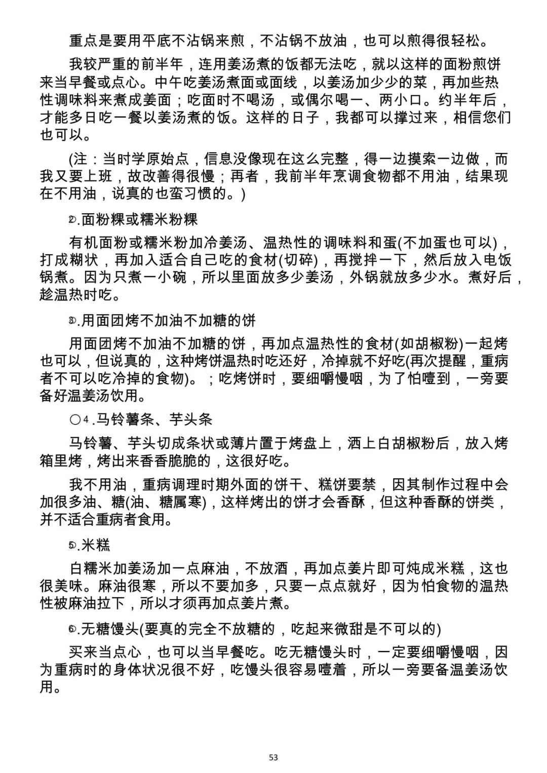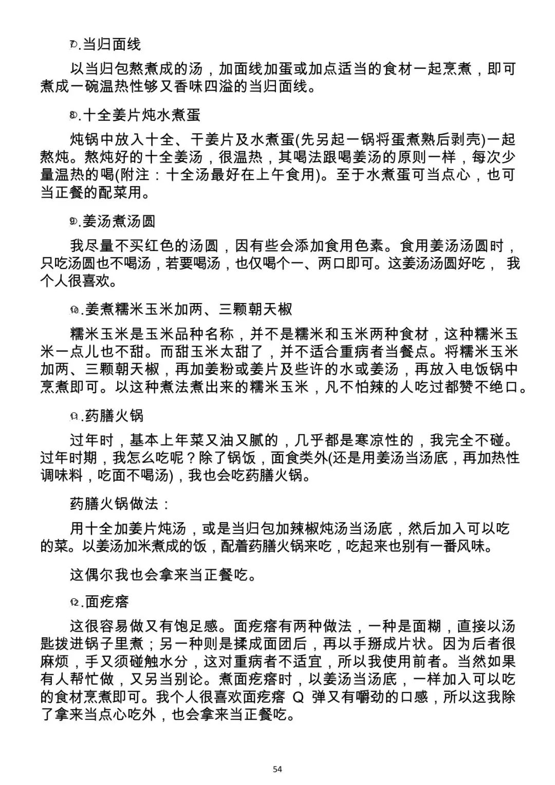重点是要用平底不沾锅来煎,不沾锅不放油,也可以煎得很轻松。我较严重的前半年,连用姜汤煮的饭都无法吃,就以这样的面粉煎饼 来当早餐或点心。中午吃姜汤煮面或面线,以姜汤加少少的菜,再加些热 性调味料来煮成姜面;吃面时不喝汤,或偶尔喝一、两小口。约半年后, 才能多日吃一餐以姜汤煮的饭。这样的日子,我都可以撑过来,相信您们也可以。