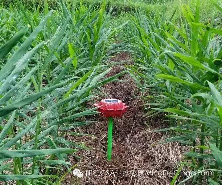4管理姜园时绝不用化肥、农药、除草剂。姜园不承认有虫害。 鸟类、虫类和姜苗自然共处,拒绝伤害任何一种。我们停用农药以避免杀生,安装了太阳能念佛机及音乐播放机24小时播放阿弥陀佛圣号、大悲咒和高山流水。