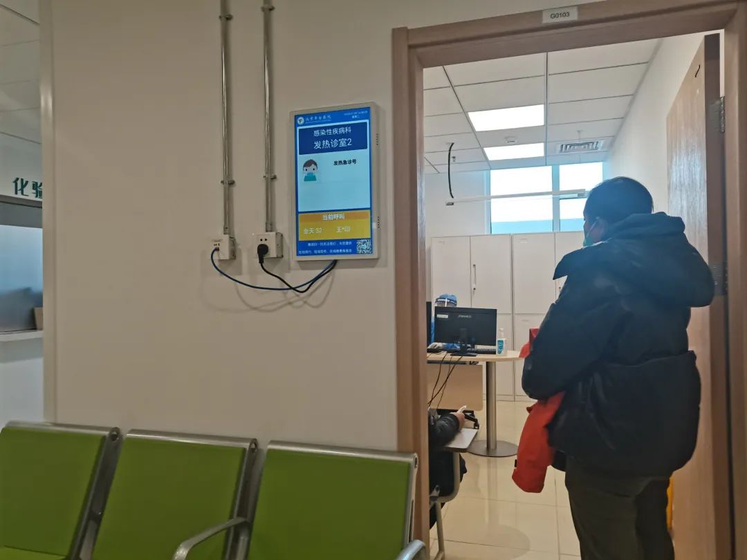 1月9日下午,在北京丰台区医院发热门诊,患者王女士在门诊室外等待候诊。她说,目前自己体温是38℃多,浑身无力,从检查结果来看,她患了乙流。