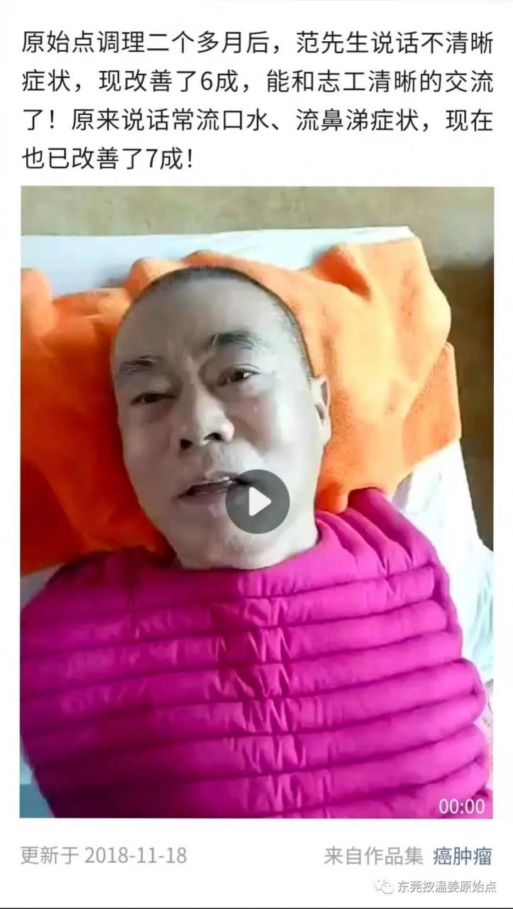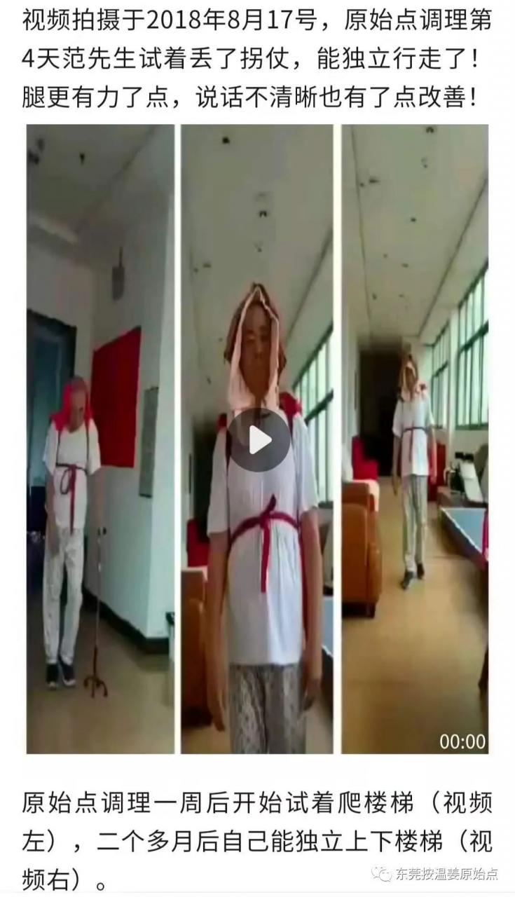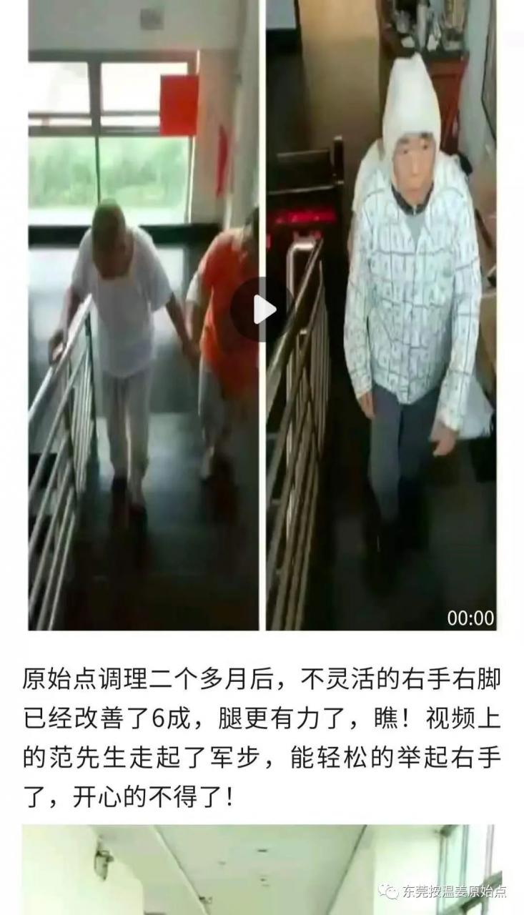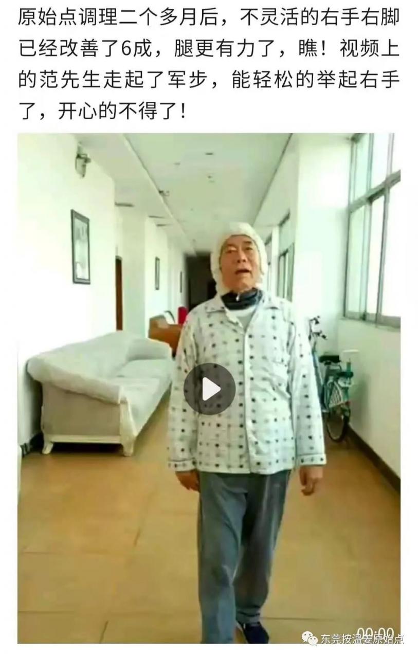 原始点调理二个多月后,不灵活的右手右脚已经改善了6成,腿更有力了,瞧!视频上的范先生走起了军步,能轻松的举起右手了,开心的不得了!