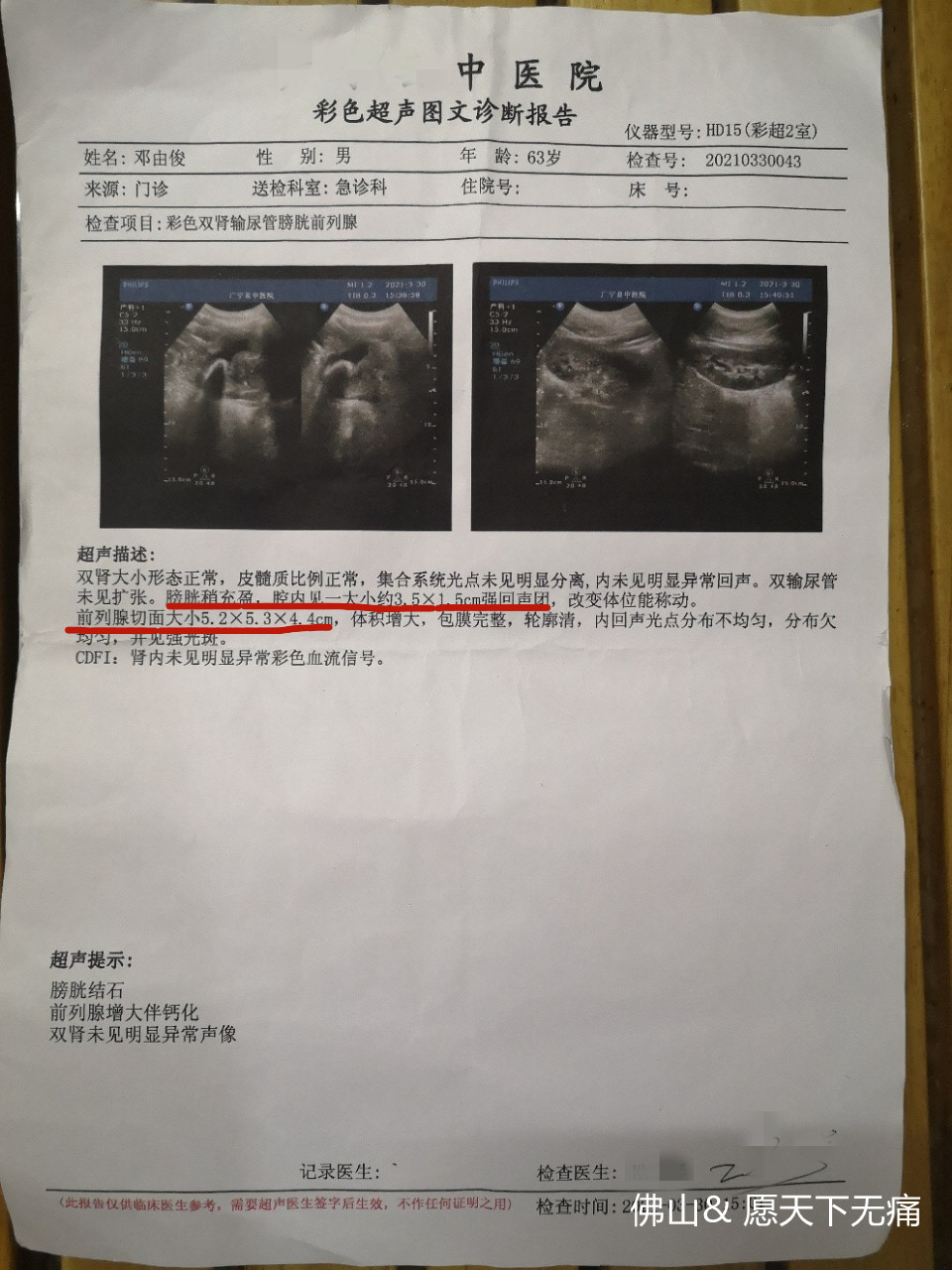 2021年3月30号,我又到广宁县中医院检查,检查结果为膀胱结石,前列腺增大,医生建议做碎石以及前列腺手术。