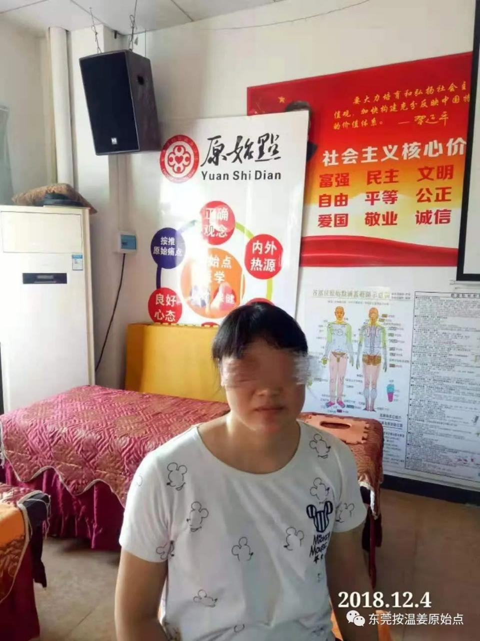 内热源(刚开始煲50克干姜,在增加到70克干姜配20克红参,到后面增加到100克干姜),外热源(原始点按推后红豆袋温敷,平常都用暧贴温敷),不吃水果牛奶等寒凉食物,温热饮食,运动(刚开始爬10层楼梯都感觉累,后慢慢坚持锻炼,到现在每天能坚持爬楼梯70层了),2018年11月25日刘女土告诉志工,这次又来月经了,而且来了10天了还未干净(不停),志工建议刘女士加强温敷,用淡姜水灌子宫冲洗,截止到2018年12月5号,刘女士原始点按推共15次,现改善情况如下: