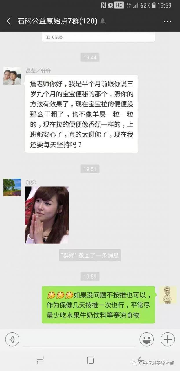 詹老师你好,我是半个月前跟你说三岁九个月的宝宝便秘的那个,照你的方法有效果了,现在宝宝拉的便便没那么干粗了,也不像羊屎一粒一粒的,现在拉的便便像香蕉一样的,上班都安心了,真的太谢你了。