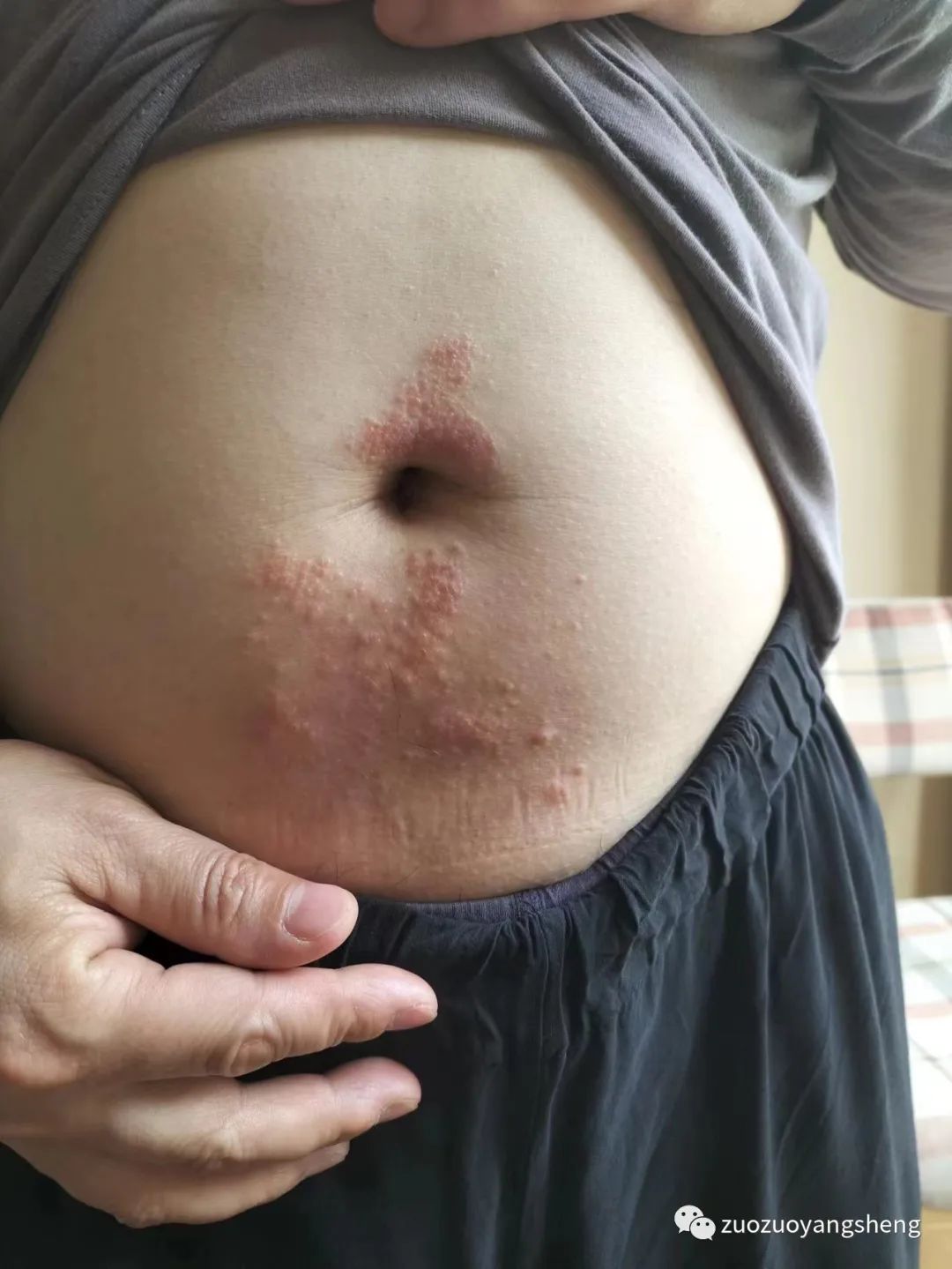 2022年4月10日,趁空闲给自己做一下艾灸,艾灸的时候出了点汗,感觉腹部有些痒,用手抓了之后,起了很多红点点。没想到越抓越痒,越痒越忍不住,抓的时候患处还不断有水溢出来。后面实在忍受不住了,就去抓了一把姜粉涂抹在患处,使劲儿搓揉,搓完之后感觉好一些了。
