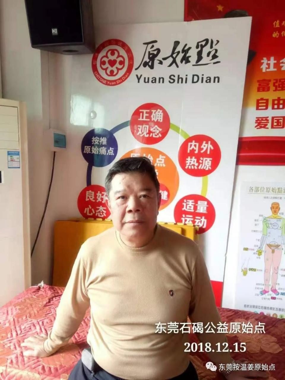 郭先生,60岁,东莞石龙人,颈椎增生二个多月(颈椎痛),做过针灸,针灸后在中药敷,治疗十多天后效果有一点点改善,不是很理想,左膝盖痛、右手臂也麻二个多月,因郭先生的爱人曾受益原始点,2018年11月20号郭先生来到了东莞石碣公益原始点调理(编号G97)。