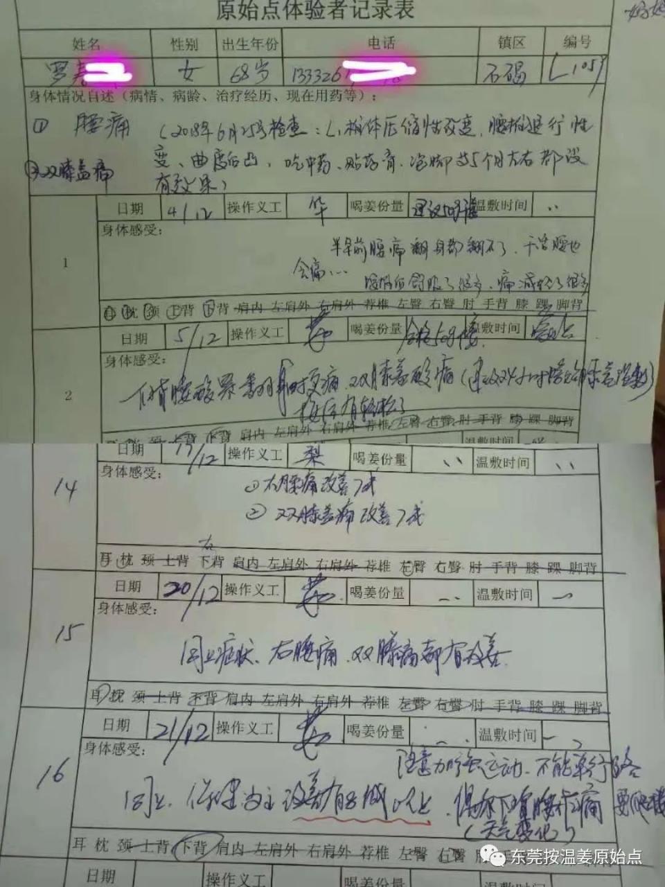 2018年12月4号,罗女士经亲人介绍结缘原始点(石碣公益原始点编号L1059),刚来时症状:腰痛(有时痛的翻身都翻不了)、双膝盖痛多年。