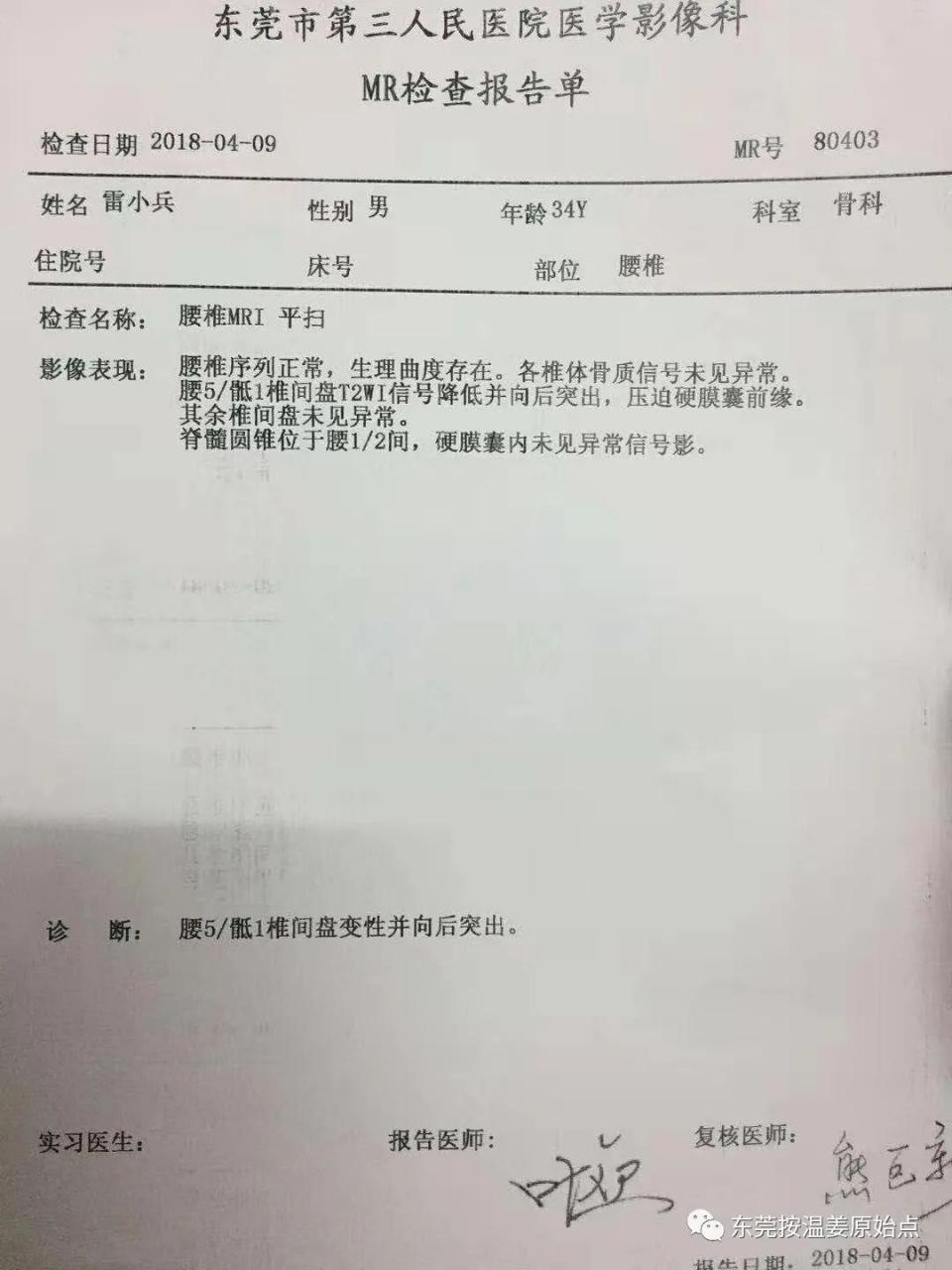 在2015年有幸接触到原始点疗法、当时是乔师傅给我治疗了4次、原始点疗法+温敷+喝姜汤、腰痛就得到缓解、但因工作的原因离开了石碣、之后有2年没犯过病,到2017年的12月份腰部一直隐隐作痛将近4个月、今年3月份再次来到尊皇工作、在邹师傅的三次治疗下、疼痛就消失了、(当时正在喝中药、喝了有20来天、没有效果、邹师傅要我停止喝中药。)到目前为止没疼过了、打雷下雨也没有感觉哪里不舒服了、真心话!感谢石碣公益原始点提供这么好的平台!感谢乔师傅、邹师傅、给我治疗最主要是没收一分钱就治好了、在之前都不知道花了多少冤枉钱了。在这里分享原始点疗法给大家、愿大家身体健康多多受益!下面是我在医院检查的报告结果。