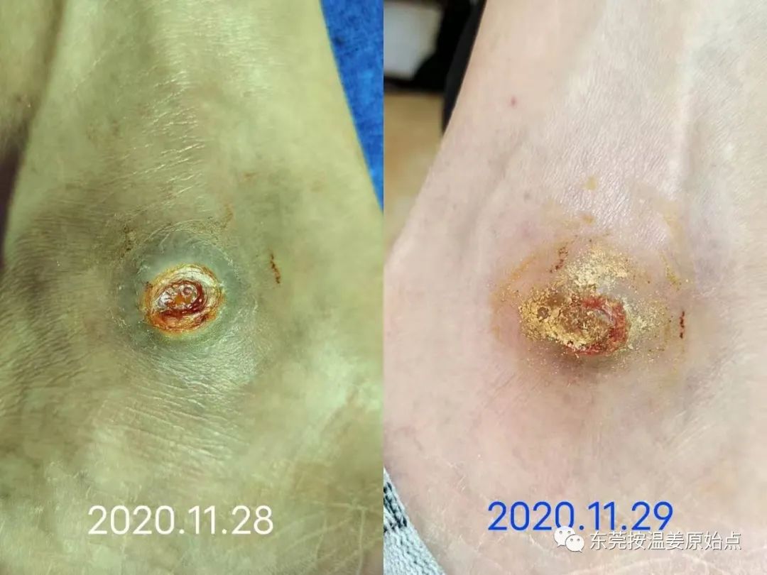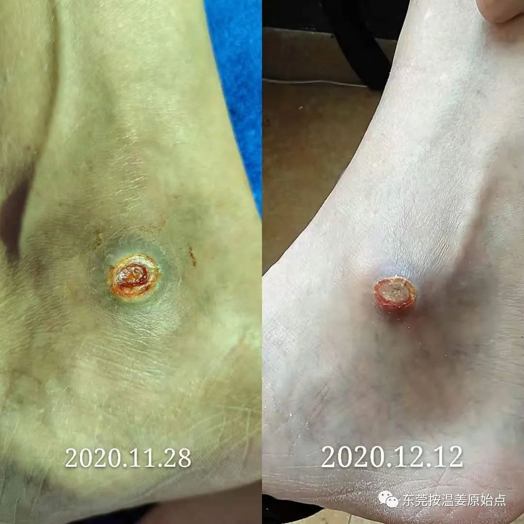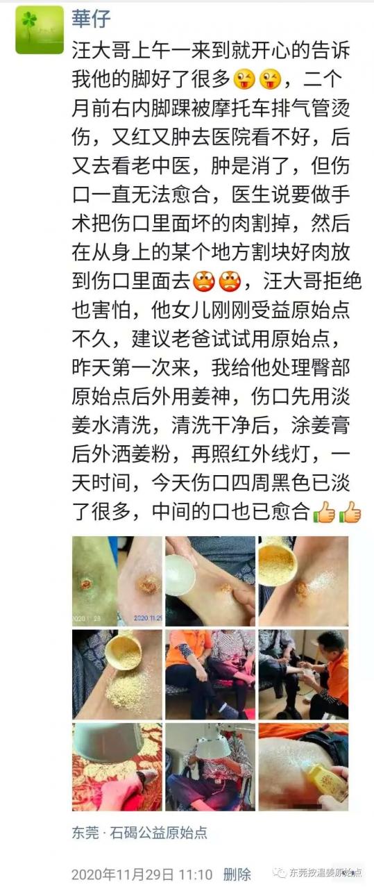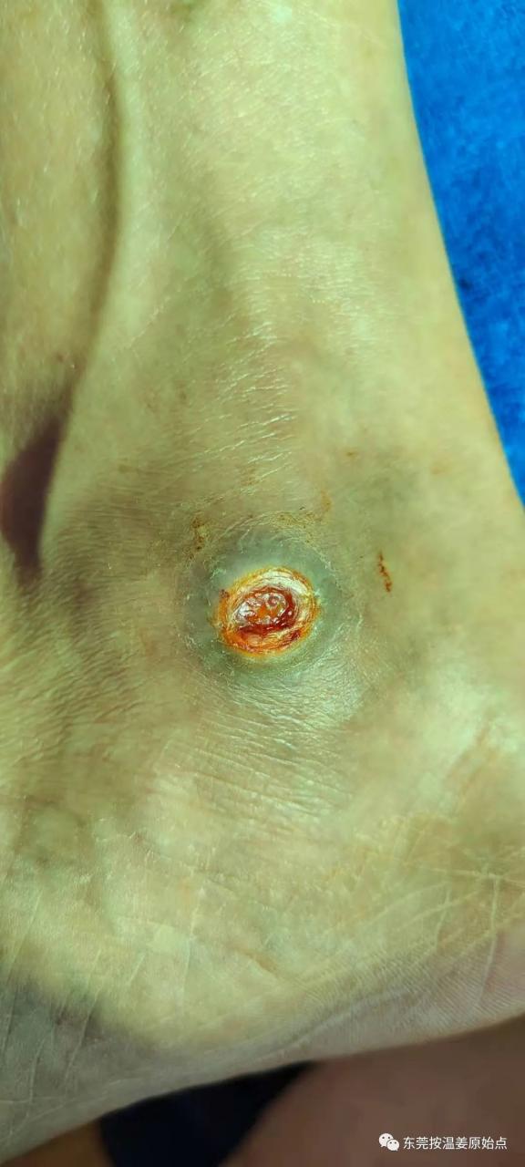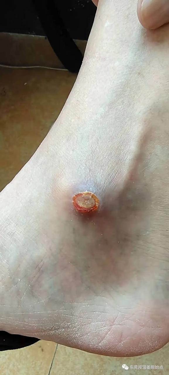 汪先生右脚内脚踝处2020年9月28号不小心被摩托车排气管烫伤,又红又肿去医院看不好,后又去看老中医,肿是消了,但伤口一直无法愈合,医生说要做手术把伤口里面坏的肉割掉,然后在从身上的某个地方割块好肉放到伤口里面去,汪大哥拒绝也害怕,没有听从医生的建议。