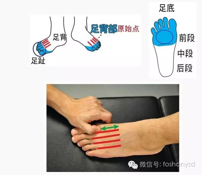 涵盖范围:足背原始点相对应之足底前段至足趾,如图中蓝色区域所示。
