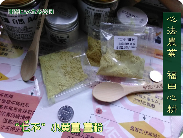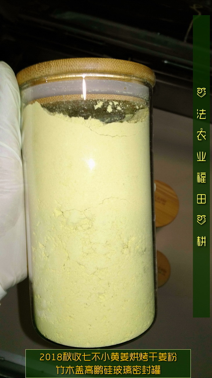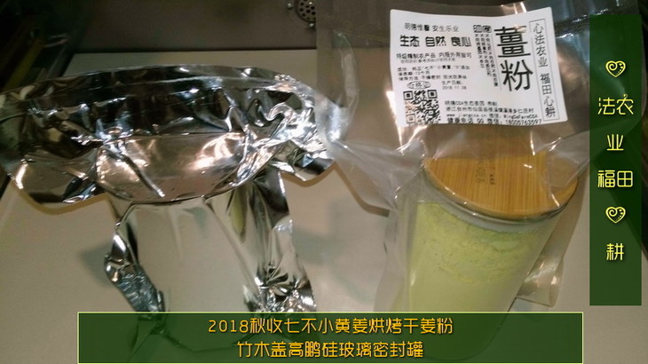 明安心法农业福田心耕明德生态姜园恭制 由2018年10月起秋收的姜园七不小黄姜烘烤后研磨成粉,筛网目数大致100-120目。
